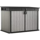 This Keter storage shed Grande Store will withstand any weather conditions and will maintain its appearance without requiring maintenance. The paintable walls allow you to customise the unit to be uniquely yours, and save you from worrying about rust, fading, dents, or peeling. This shed presents the perfect storage solution for two 360 L/96 gal. or three 240 L/63 gal. wheelie bins, two adults and two children’s bikes, or gardening tools. Additionally, a wooden shelf can be installed using the included adjustable brackets to expand the storage options. This storage unit also has a sloping threshold, a locking system, built-in ventilation and adjustable brackets to install an extra shelf.